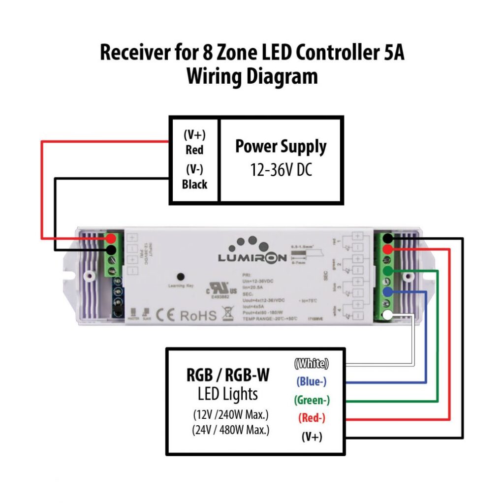 The LUMIRON’s 8 Zone RGBW LED Controller Receiver is a wireless color controlling system that consists of a sender and a receiver or several receivers. By selecting switch status, you can set the system as RGB 3-channel output, or RGBW 4-channel output. Using an easy RGBW remote controller, you can choose any color from RGBW to adjust so as to mix more than 100 million kinds of colors. With built-in 10 kinds of color-changing modes, you can easily switch color-changing modes and adjust speed and brightness. “Function Pause” enables RGBW LED to stay at your favorite color under the situation of color-changing modes, which operation is simple but functional.