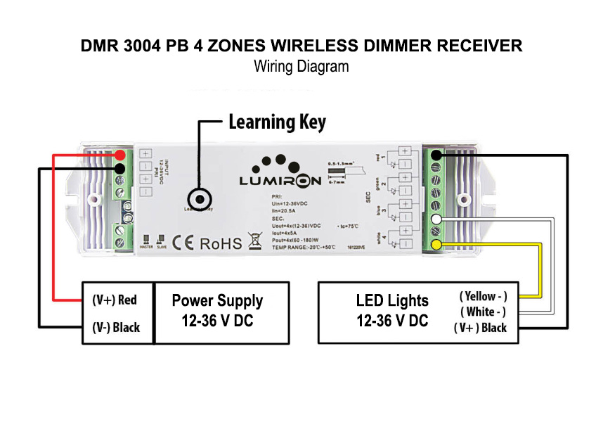 The DMR 3004 PB 4 Zones Wireless Dimmer Receiver has been designed to bring light control easily up to 4 different zones. The remote controller can save up to 2 colors/ 3 modes corresponding to each different zone. The color wheel on the controller allows the user to choose the color of their choice. After the installation is complete, you can change the brightness from 0% to 100% brightness. It runs on 3 internal AAA 1.5V batteries (included) and includes a receiver. The wireless design saves time and energy by requiring no cabling or installation to pair it with the LED zone. It is IP20, please avoid the sun and rain. When installed outdoors, please ensure it is mounted in a waterproof enclosure. Always be sure to mount it in an area with proper ventilation to avoid overheating. It is easy to install and operate and will provide many years of easy operation.