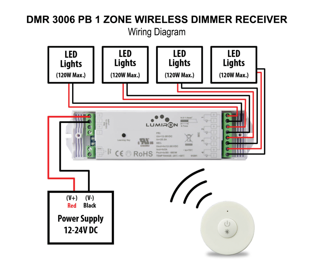 Our DMR 3006 PB 1 Zone Wireless Dimmer Receiver is a wireless dimming and ON/OFF system for any LED Product that works at 12VDC, 24VDC, or 36VDC. The 800mhz wireless remote can be placed anywhere and works as an ON/Off switch and dimmer with just one button. Easily adjust your LED Lights to your preferred brightness level and the unit will memorize the setting, so next time you turn on the lights they will light up at exactly the same level they were before they were turned off. This product includes a PUSH BUTTON WIRELESS DIMMER and one UL Listed RECEIVER ensuring the safety and durability for the lifetime of the receiver. It is IP20, please avoid the sun and rain. When installed outdoors, please ensure it is mounted in a waterproof enclosure. Always be sure to mount it in an area with proper ventilation to avoid overheating. It is easy to install and operate and will provide many years of easy operation. The operation is very simple: Press the center button on the remote for less than 1 second to turn On or OFF. Press and hold the button to Increase/Decrease brightness.